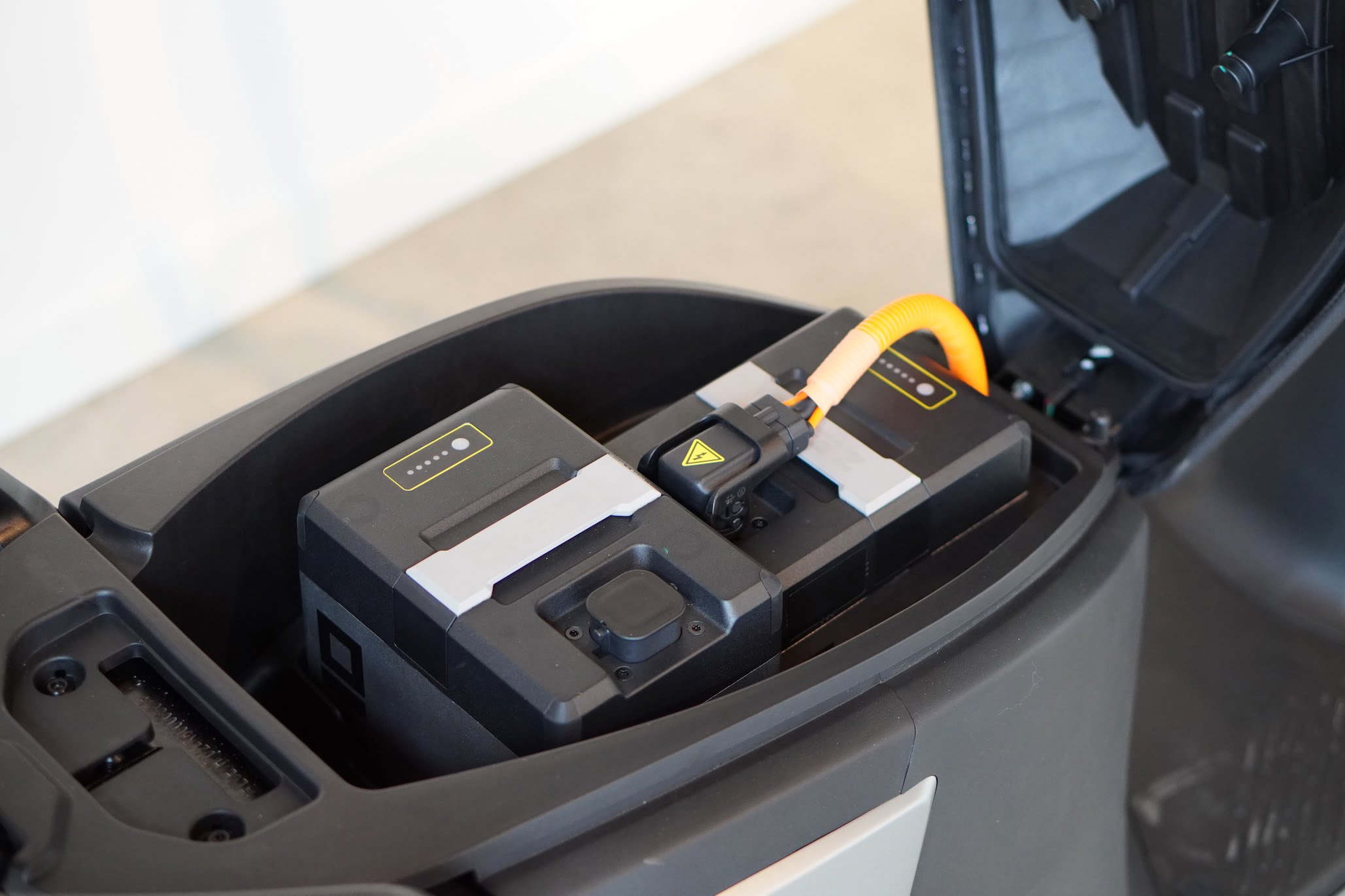 Ingebouwde lader,daardoon geen extra oplaadapparatuur nodig, de standaard ingebouwde oplader van 520 W kan in elk stopcontact worden gestoken. Overigens wordt er alsnog een losse lader meegeleverd, de accu’s zijn ook uitneembaar zodat je indien nodig de accu’s ook binnen kunt opladen.