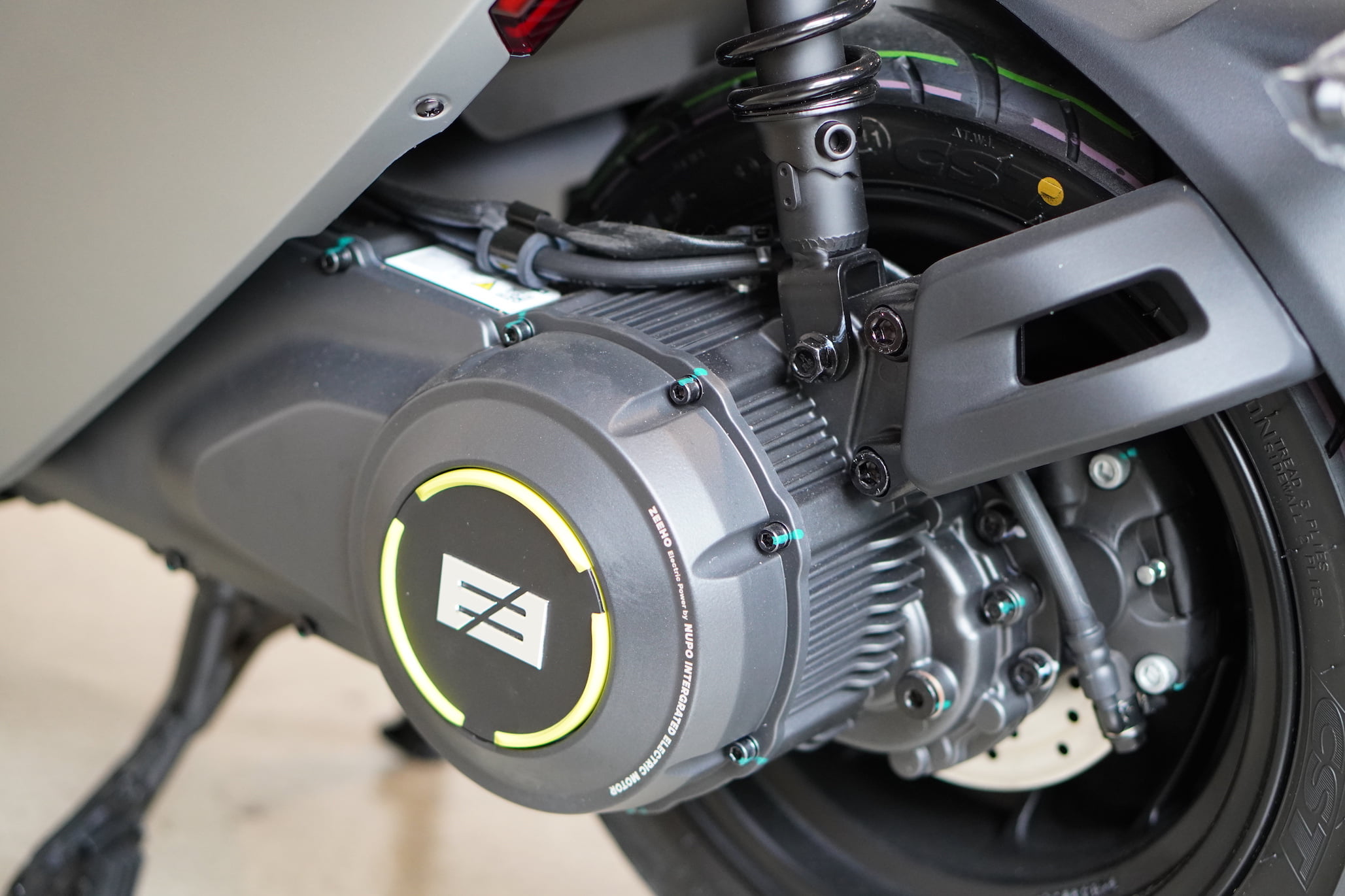 Zijdelings gemonteerde elektromotor waarvan de acceleratie te vergelijken is met een 125CC motorfiets.